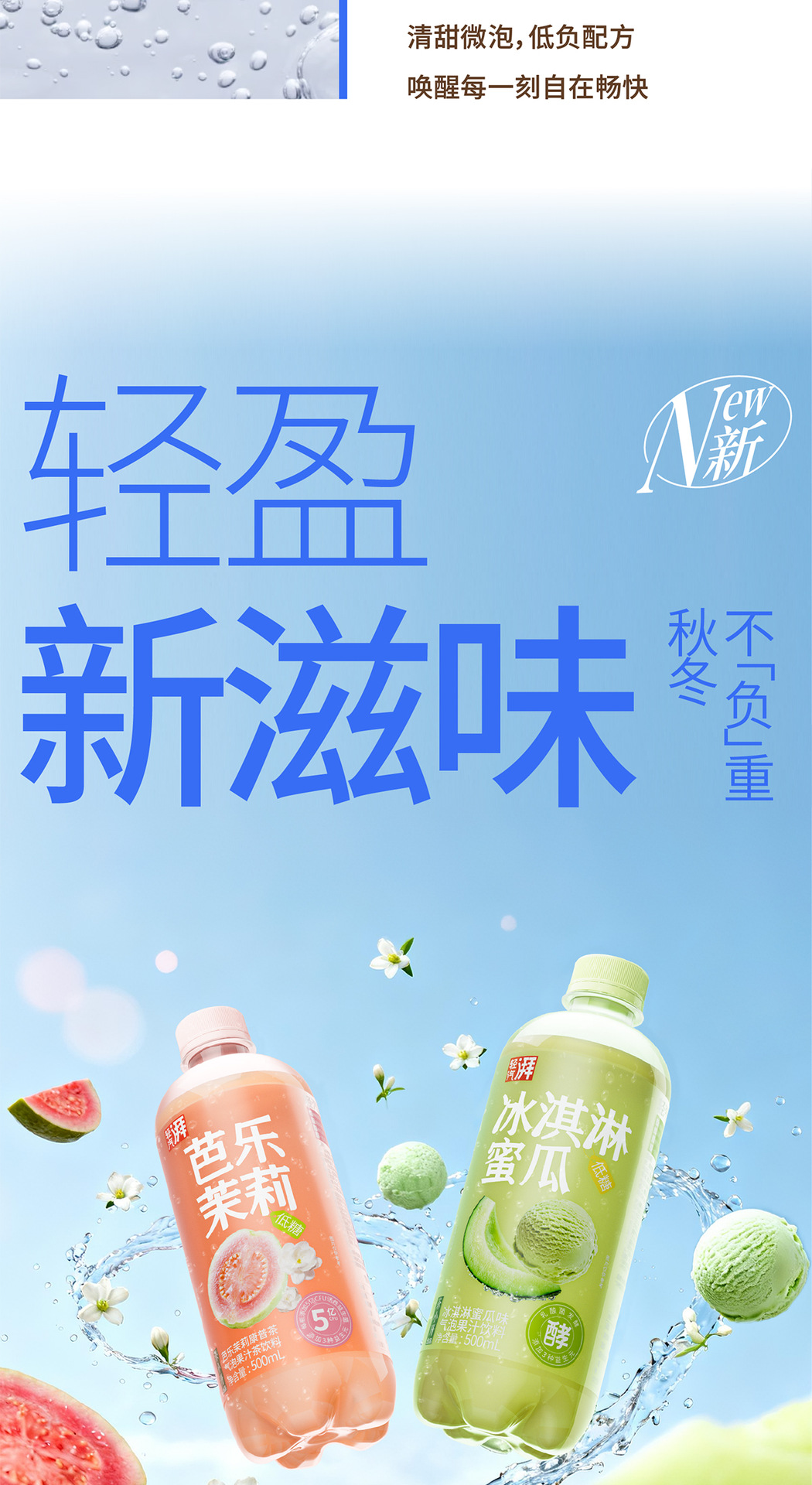 茶小开轻汽湃气泡饮料500ml*15瓶 芭乐茉莉冰淇淋蜜瓜味果汁饮料