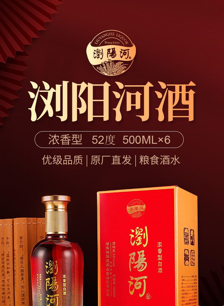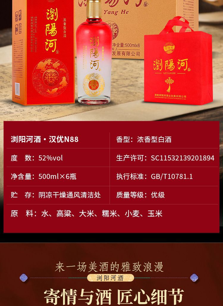 白酒整箱浏阳河N88纯粮食酒52度浓香型白酒500ML*6瓶礼盒装